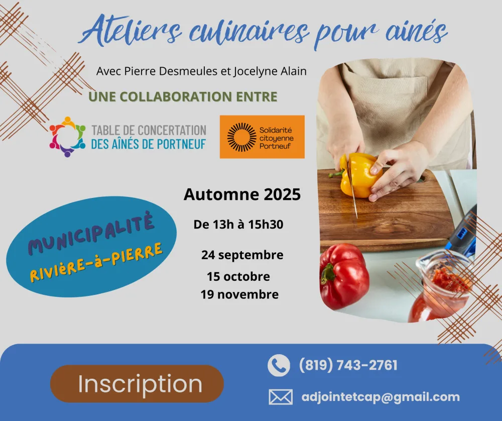 Ces ateliers ont pour but de lutter contre la vulnérabilité alimentaire et aussi pour briser l'isolement. Le prochain atelier est prévu le 15 octobre 2025 à Rivière-à-Pierre (lieu à confirmer).