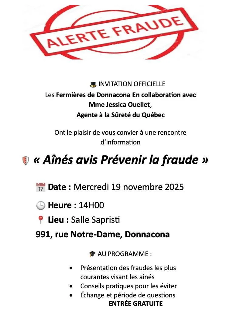 Les Fermières de Donnacona, en collaboration avec Jessika Ouellette, agente à la Sûreté du Québec, poste de Pont-Rouge, vous présente cette conférence le 19 novembre prochain à 14h à la Sapristi du relais à la Pointe aux Écureuils.